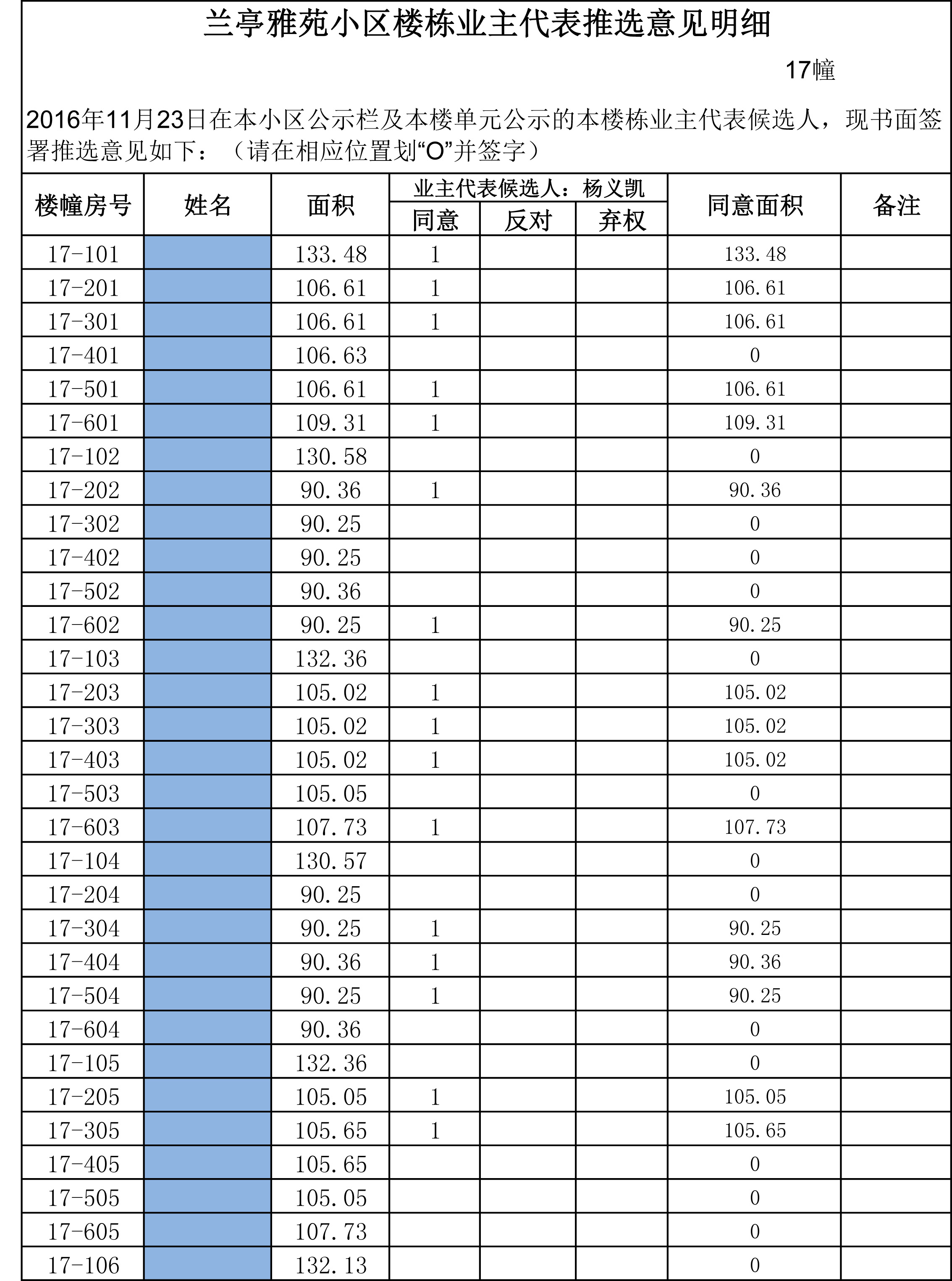兰亭雅苑小区楼栋业主代表推选意见明细(17幢)