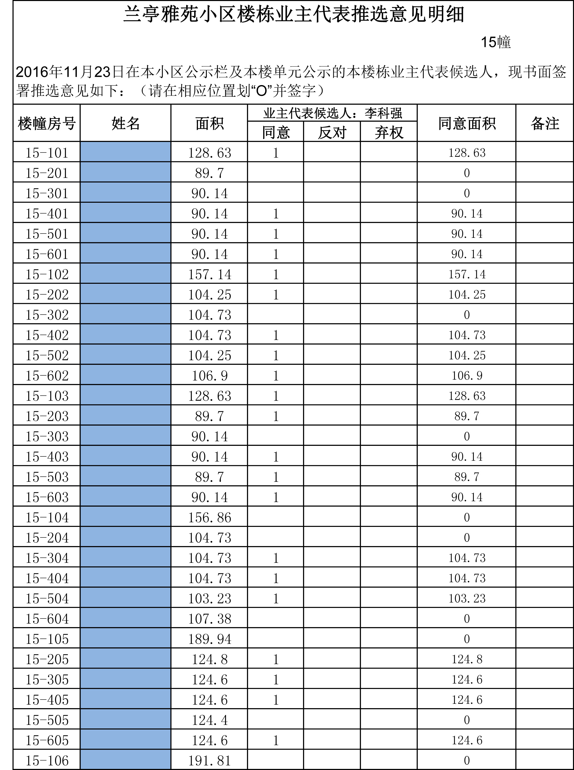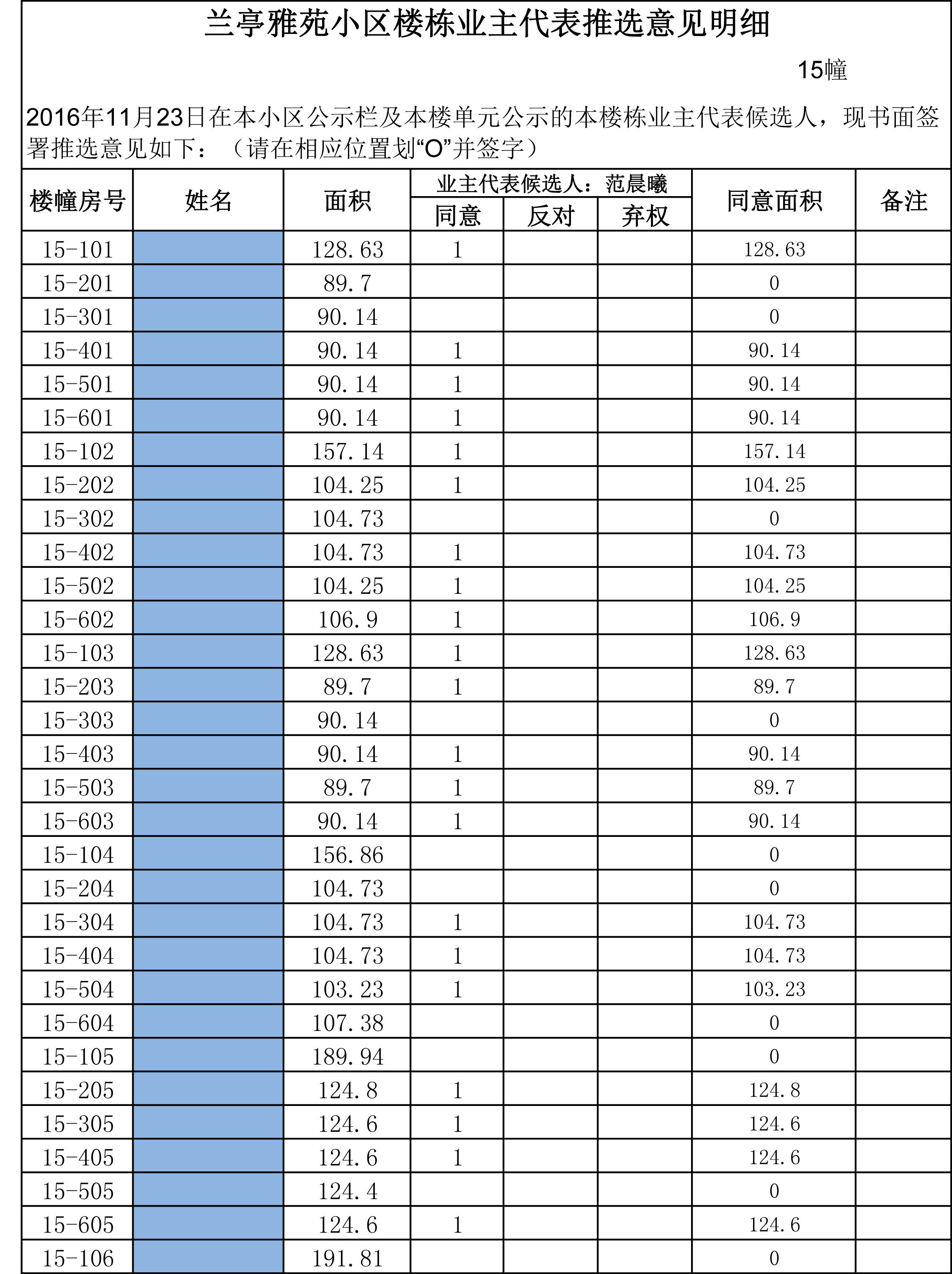 兰亭雅苑小区楼栋业主代表推选意见明细(15幢)