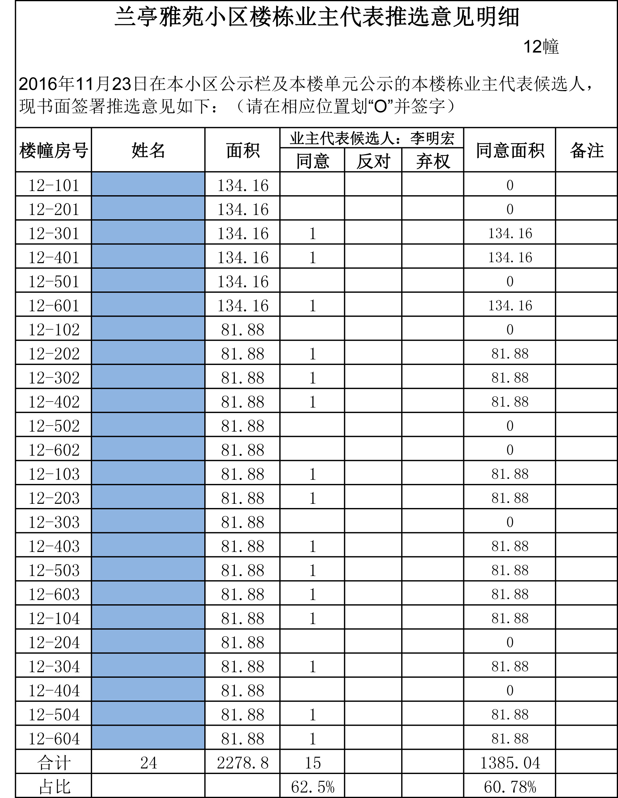 兰亭雅苑小区楼栋业主代表推选意见明细(12幢)